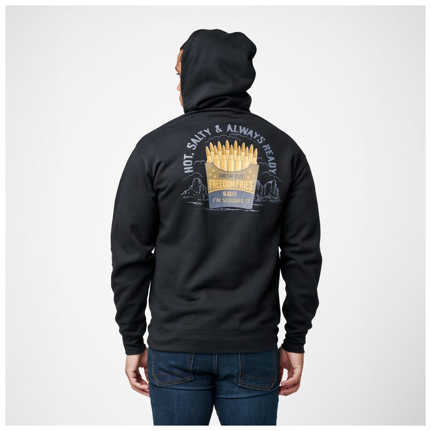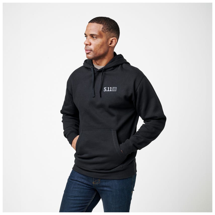Comfortable and unafraid of standing out, the 5.11® Hoodie is made with a soft cotton/poly blend in a medium weight fleece, has a wide elastic waistband and cuff and a standard kangaroo-front pocket. Its jersey-lined hood has pull cords for easy adjustment.