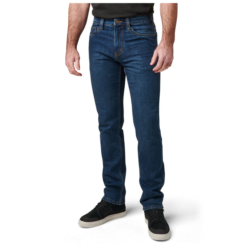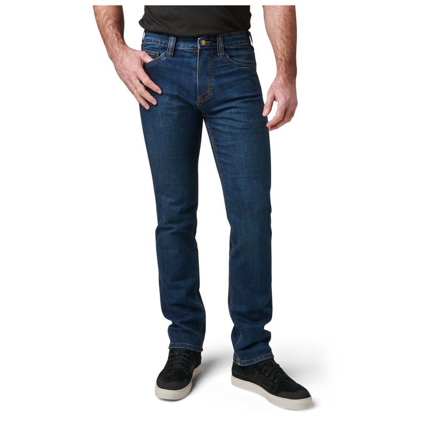 Blending in doesn't require surrendering EDC space or comfort with our Defender-Flex Jean Straight pants. Their classic, straight-cut look will fit in anywhere you go. The five-pocket style with an additional two pockets make an ideal choice when leaving critical gear behind is not an option. A non-logo, shank-button closure up front, along with non-logo rivets at the hand pockets keep things discrete. Reinforced belt loops and hand pockets reinforced with Nylon 6 increase longevity. Constructed from 76-percent cotton and 24-percent polyester with T400 mechanical stretch denim, the Defender-Flex Jean Straight will never bind on you. It's the perfect jean for a weekend in the backcountry or a night out on the town. More styles available: shop the Defender-Flex Collection.