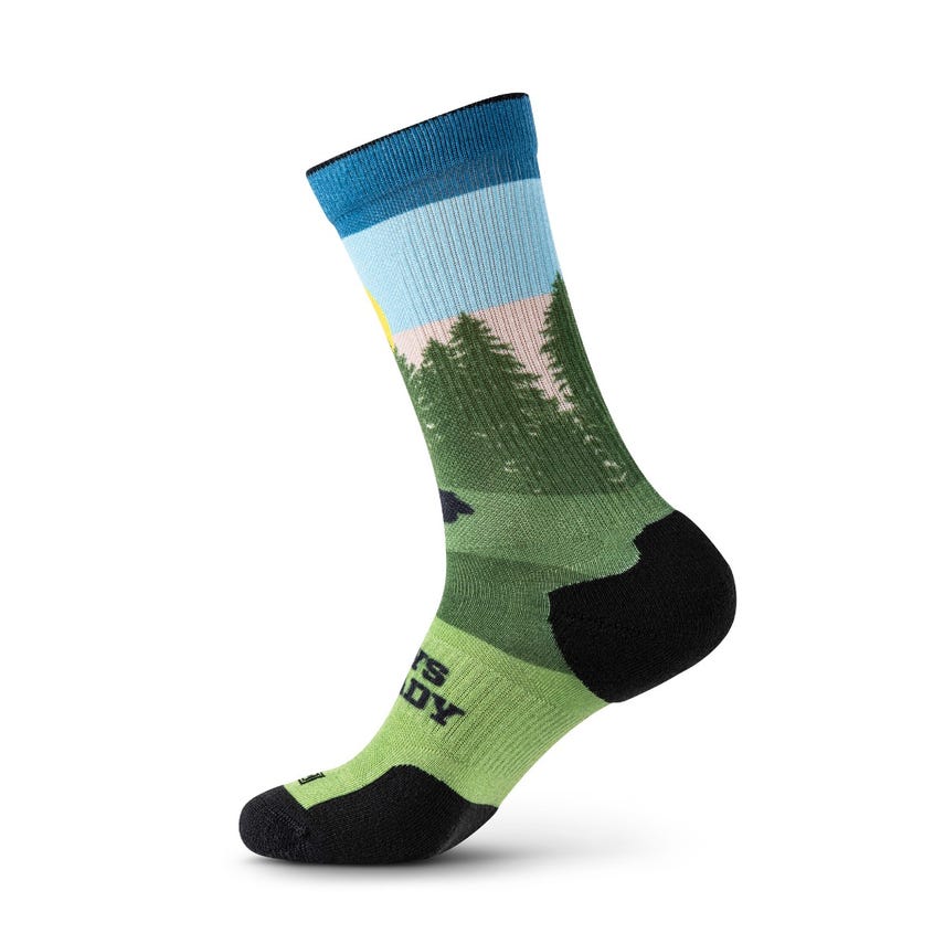 Step into adventure with the Sock & Awe New Horizon socks. Featuring a serene landscape graphic with the inspiring motto ?Always Be Ready,? these socks are perfect for those who prefer their roadrunner spirit with a dash of sunrise tranquility. Designed for comfort and crafted with a nod to preparedness, these socks are your stylish companion for whatever path you tread.