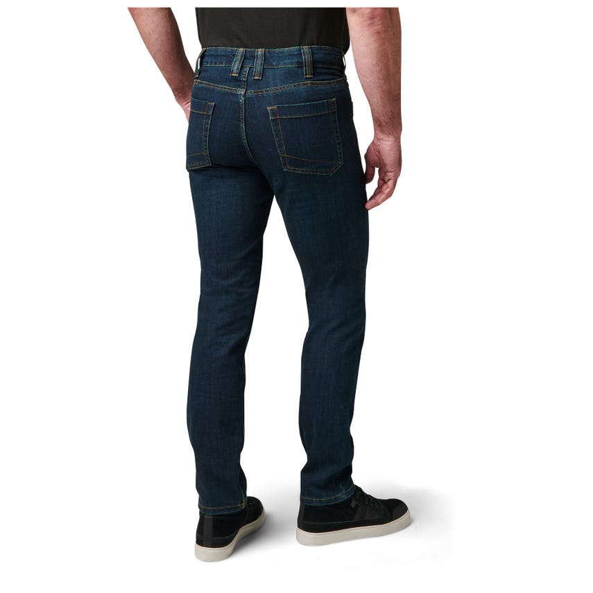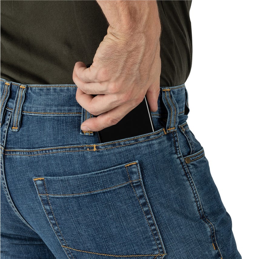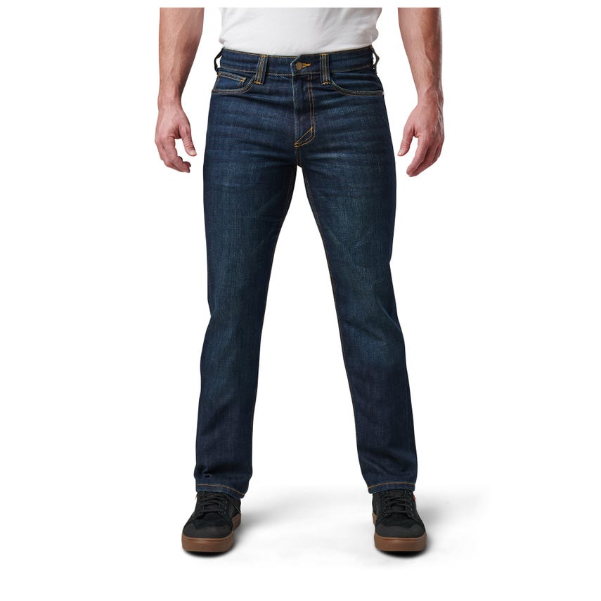 Blending in doesn't require surrendering EDC space or comfort with our Defender-Flex Jean Straight pants. Their classic, straight-cut look will fit in anywhere you go. The five-pocket style with an additional two pockets make an ideal choice when leaving critical gear behind is not an option. A non-logo, shank-button closure up front, along with non-logo rivets at the hand pockets keep things discrete. Reinforced belt loops and hand pockets reinforced with Nylon 6 increase longevity. Constructed from 76-percent cotton and 24-percent polyester with T400 mechanical stretch denim, the Defender-Flex Jean Straight will never bind on you. It's the perfect jean for a weekend in the backcountry or a night out on the town. More styles available: shop the Defender-Flex Collection.