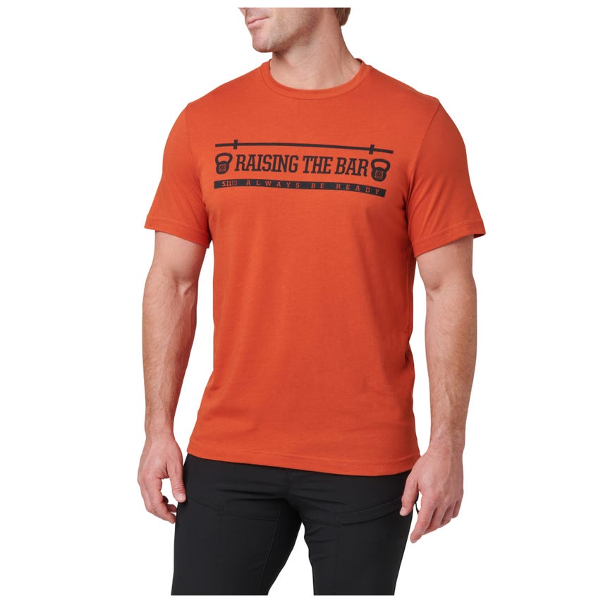 Why settle for lifting spirits when you can raise the bar? Channel your inner warrior with this "Raising the Bar" tee?complete with kettlebell graphics for gym aficionados. Crafted from a comfortable ringspun cotton/poly blend, it's durable enough to withstand both time and the sun's rays. Whether hitting the weights or the streets, this tee has you covered in style.