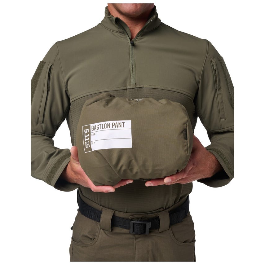 The Bastion Pant has a shaped waistband with high back for coverage and wide hook and loop plus snap belt loops large enough to accommodate duty belts. Zippered front fly with snap closure and reverse welt zippered hand pockets.
