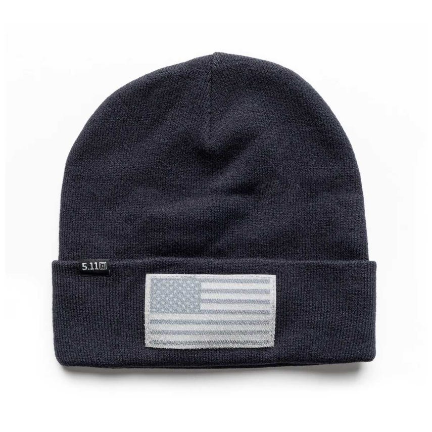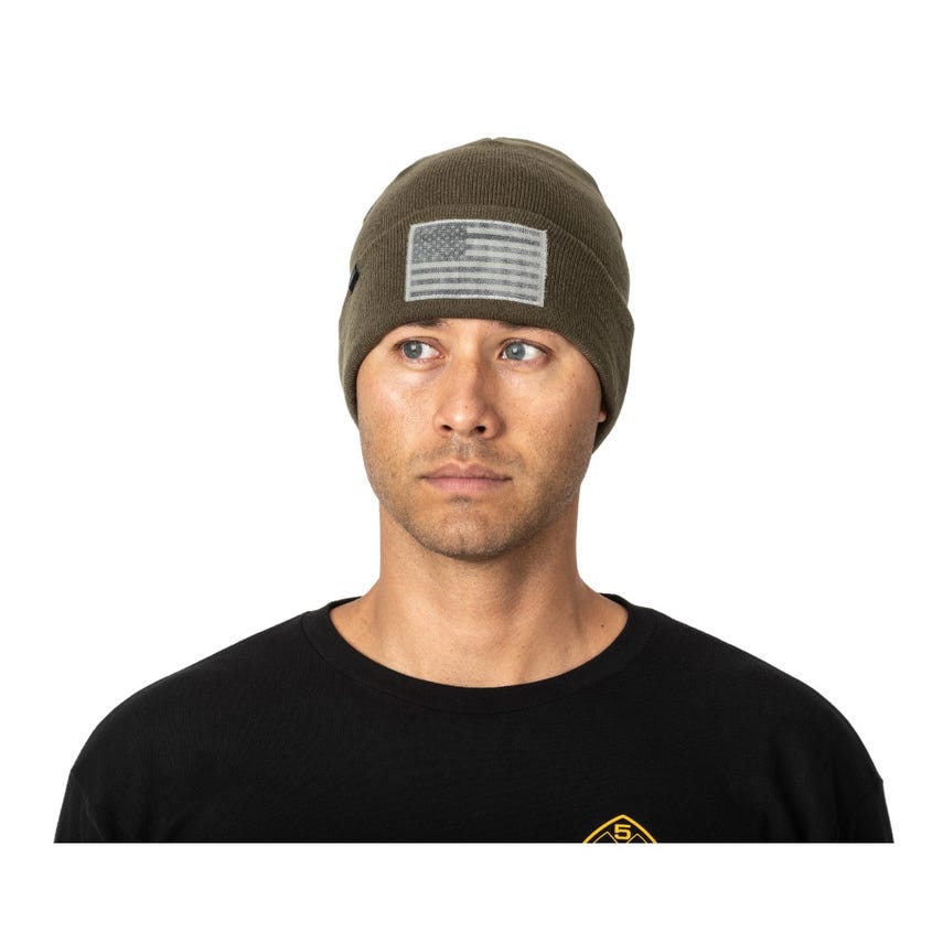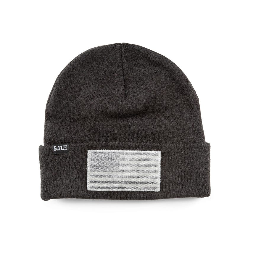 The Cuffed Flag Bearer Beanie features an American flag loop patch at the front center and is a smooth knit of 95% acrylic and 5% elastane.