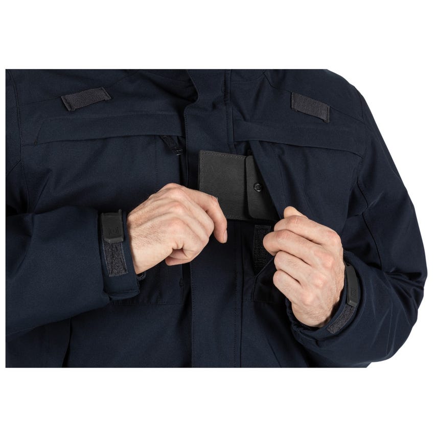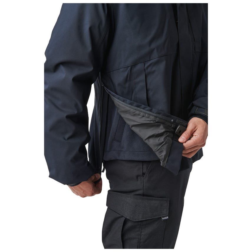 Compromise is not an option when lives and safety are on the line. Professionals need the best when working in the worst weather and conditions. That's why we've introduced our 5-in-1 Jacket 2.0. It's 8% lighter than its predecessor and much more flexible thanks to an outer shell of mechanical stretch polyester. The fully seam-sealed 10K waterproof and 10K breathable fabric with DWR provides Blood Borne Pathogen resistance. When it's pouring, cover up with the removable hood that can be rolled into the collar or stored in back pocket. A new Quixip® system on the sides offers enhanced ventilation and rapid firearm access. The two-piece setup's removable interior liner features zip-off sleeves and a side zipper to provide even more versatility. Tech fleece construction ensures years of service and, when coupled with the shock cord at the hem, keeps warmth in. Add a pair of document pockets on both layers, and you have the 5.11® answer to tough situations.