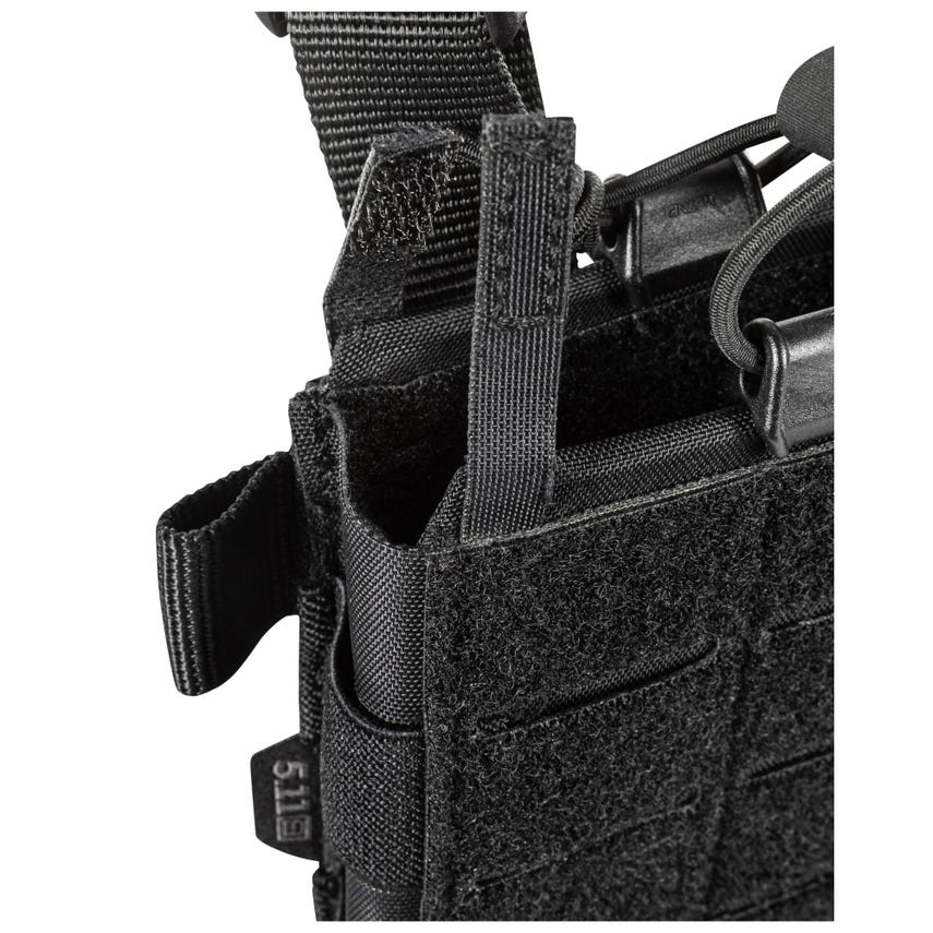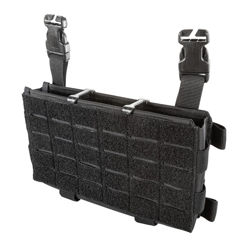 The Patent Pending Smart Track System is a dual-rail construction with removable and adjustable custom dividers and bungee retention kits to provide a secure fit and retention for contents. The interior of the placard is also loop lined and compatible with hook compatible inserts including the divider, flap and zipper top from the Modular Mini Pouch (56835). Fits three AR/5.56 magazines or two AK/7.62 mags or other equipment.