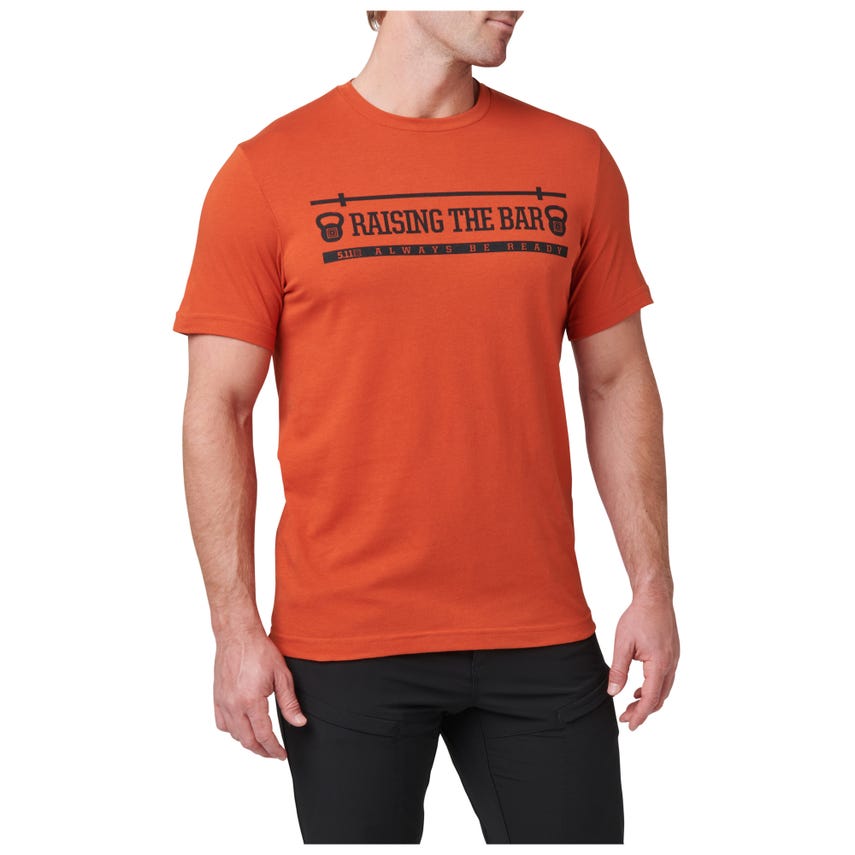 Why settle for lifting spirits when you can raise the bar? Channel your inner warrior with this "Raising the Bar" tee?complete with kettlebell graphics for gym aficionados. Crafted from a comfortable ringspun cotton/poly blend, it's durable enough to withstand both time and the sun's rays. Whether hitting the weights or the streets, this tee has you covered in style.