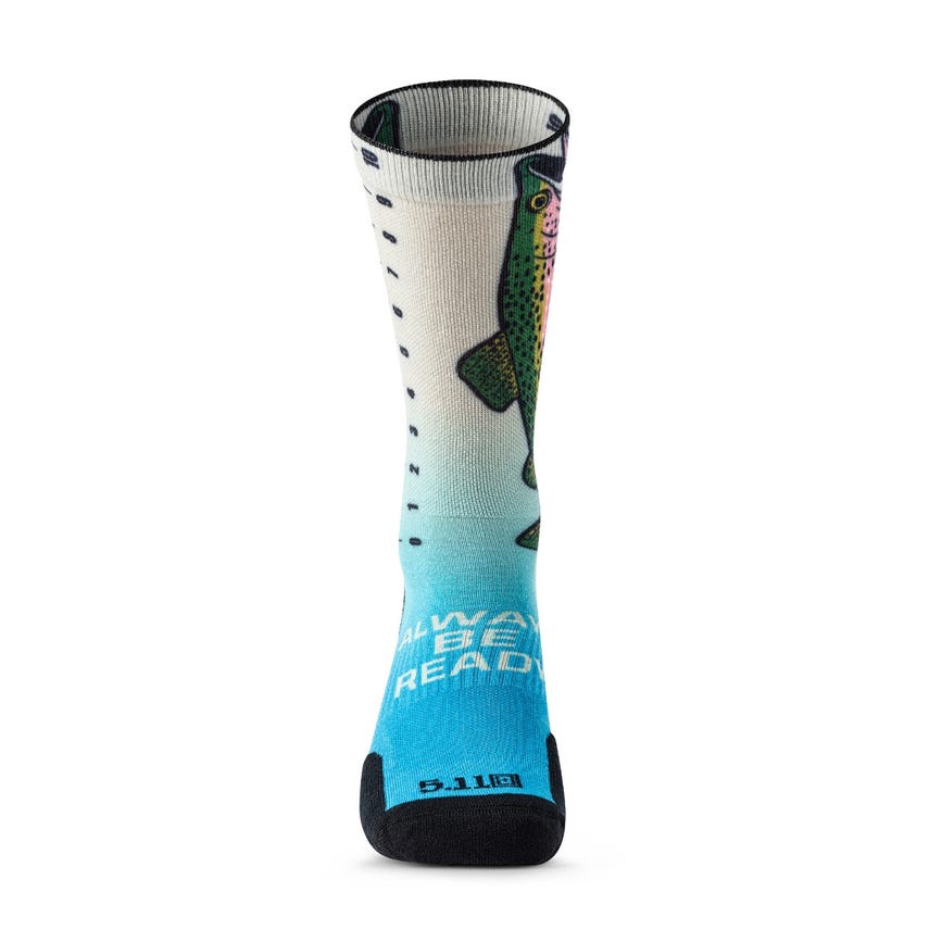 Reel in the comfort with the Sock & Awe Trout On! These fun socks boast a unique design resembling a measuring tape, perfect for those who love to fish for compliments. With the playfully bold "Always Be Ready" message, these socks ensure you're stylishly prepared. Dive into durability and fun with 5.11 Tactical's inventive flair.