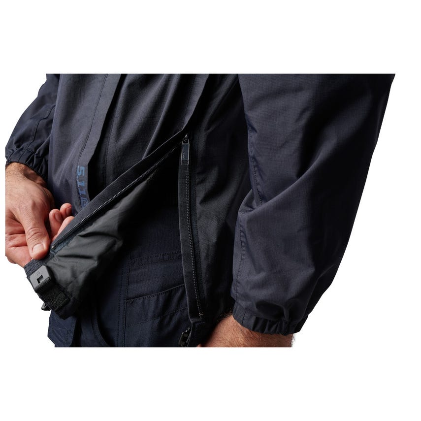 Wet weather won’t slow you down if you’re wearing the lightweight Tac-Dry Rain Shell 2.0. We took our original Tac Dry Rainshell and beefed up the performance with an even tougher 20K waterproof and 10K breathable 2L ripstop with DWR finish. Completely seam-sealed, the Tac-Dry Rain Shell 2.0 combines a new stationary hood, updated elastic sleeve cuffs, protective storm flap and an inner chin guard to keep wind and water at bay. When the skies clear, easily roll the brimmed hood back into the collar. The mesh lining serves double duty by providing added protection and all-day comfort. Both sides of the chest and the back feature pull-out ID panels. Carry your notepad, phone and other patrol necessities in the external zippered pockets and internal chest pocket. The patented 5.11® Quixip® release system on the sides allows quick access to your duty belt, while the internal shock cord keeps your rain gear in place.