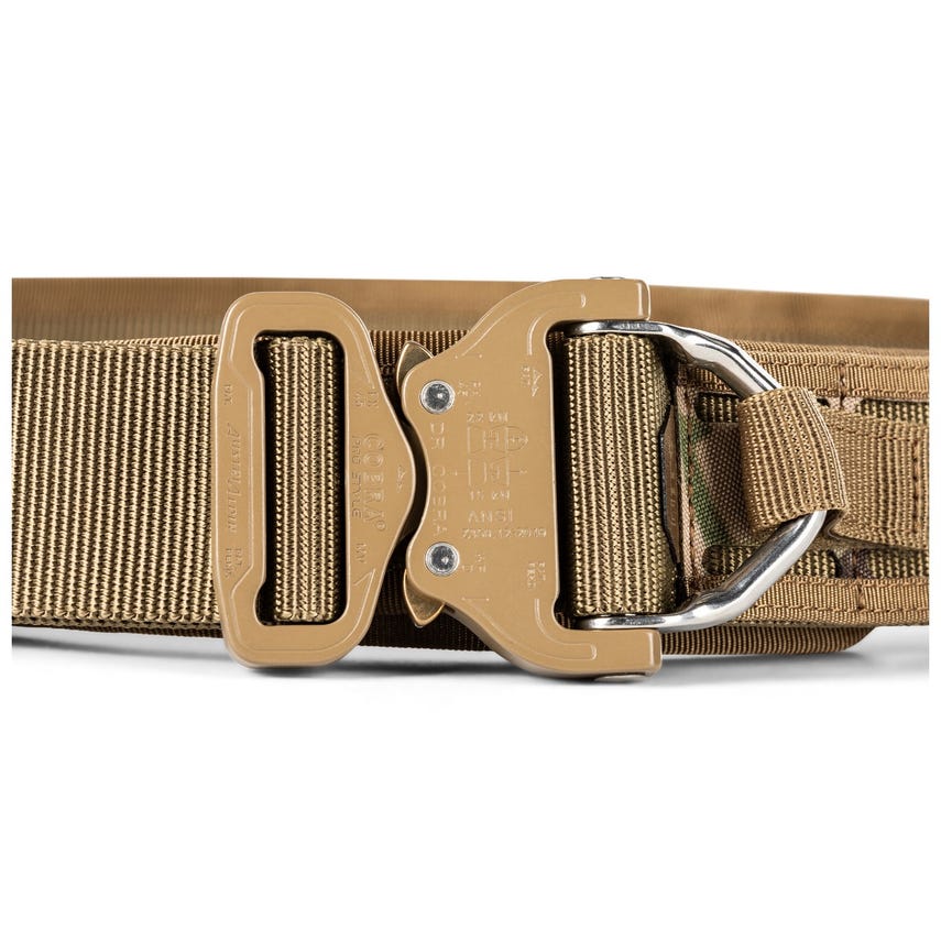 Uncomfortable and abrasive gear belts that require escape-artist skills to don and ditch are a thing of the past with our Maverick Battle Belt D-Ring. The AustriAlpin COBRA® buckle gets you in and out fast. Our Maverick Battle Belt D-Ring uses a multi-layer approach to providing all-day comfort that begins with proprietary TAC-LAM™ high-strength laminate on the outer belt in an ergonomically curved shape. It wears dual nylon webbing in the interior with a hook face that securely attaches to the interior, loop-faced nylon belt. Generous laser-cut laminate MOLLE slots provide plenty of real estate for attaching duty gear. A tie-down strap secures the D-ring when not needed. Authentic MultiCam print.