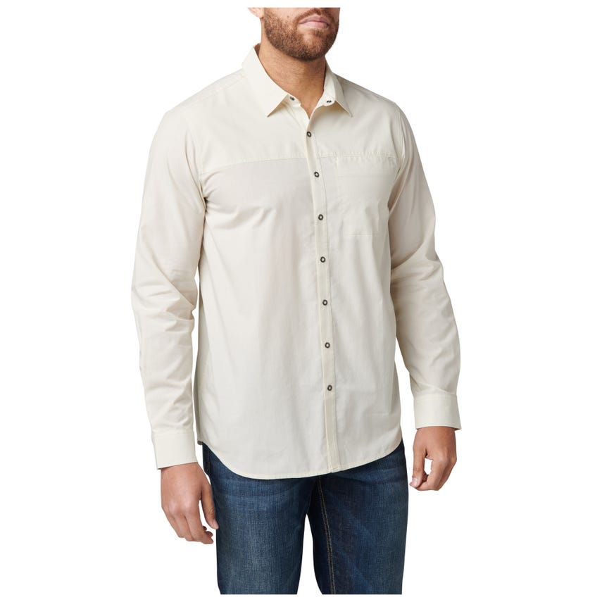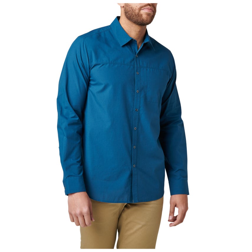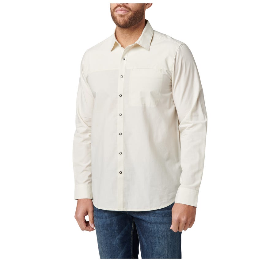 The Igor Solid Long Sleeve Shirt sports a contemporary look that works just as hard after hours as it does on the job. Constructed from 60% cotton and 40% polyester poplin, the Igor provides long-lasting comfort and wear. Beneath that exterior beats the 5.11 functionality you’ve come to expect. Our center-front RAPIDraw™ snap placket enables fast access to EDC gear, phone, wallet or passport. A fold-down collar, shirt-tail hem and button-adjustable cuffs keep everything on point. The on-seam pocket on the left chest provides traditional storage for items that don’t require added security.