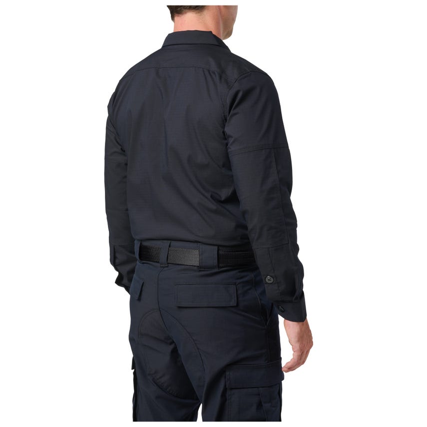 Now available in 5.11's Flex-Tac® mechanical stretch fabric, the TDU® shirt offers time-tested performance and utility for tactical duty uniforms. ReadyPocket™ at left and right chest, double-layered rear yoke and mic cord pass through. The Flex-Tac TDU shirts feature melamine buttons behind a center front placket and include epaulette and badge tab kits packaged with the product. Imported.