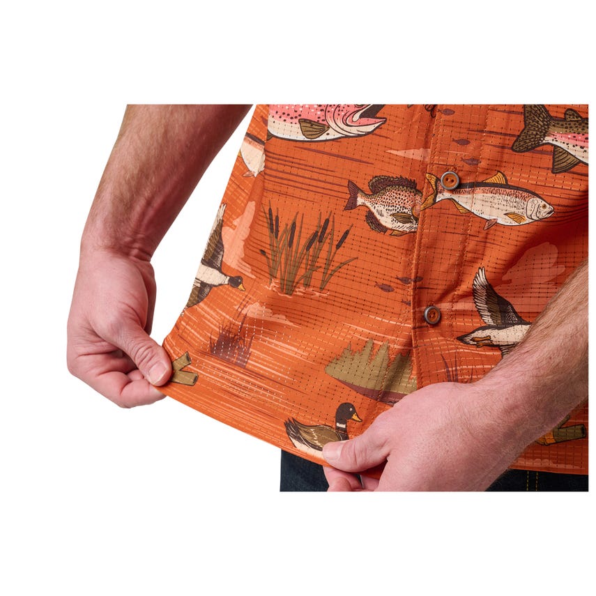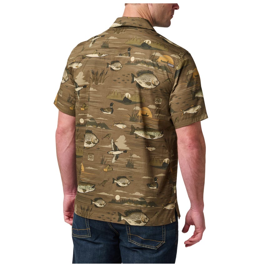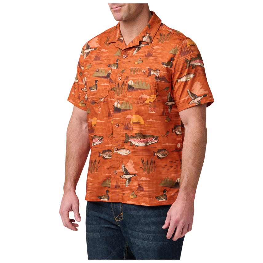 Remain chill but ready in our lightweight Adventure Print Short Sleeve Shirt. Designed for EDC carry, this laidback shirt wears Neu-Vay Camo patterns that blend in by subtly standing out. The center front RAPIDraw™ snap placket provides fast, reliable access to your CCW. A pair of patch pockets and a pen pocket on the chest keep critical items at hand. The 100% polyester construction, with Vent-Tac™ properties and wicking finish, keeps you cool undercover or off duty. This button-down style is finished with a fold-down camp collar and a double-layer back yoke. The straight hem rides at the ideal length for IWB concealment, making the Adventure Print Short Sleeve Shirt the perfect partner for warm-weather carry.