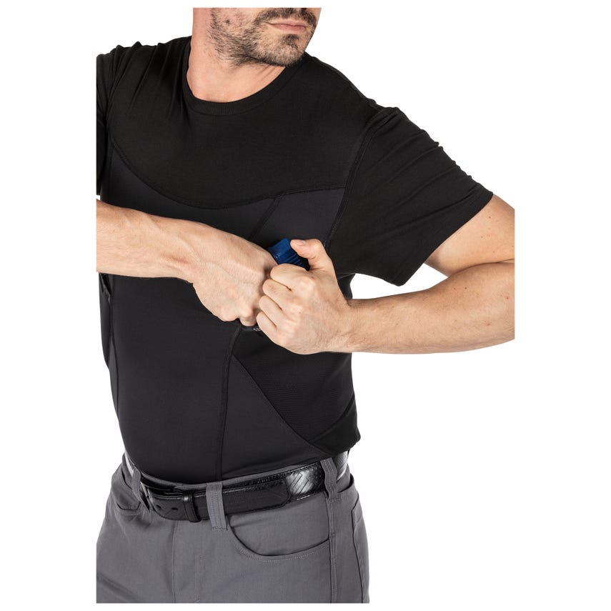 The CAMS next-gen compression short sleeve base layer tee is an outstanding concealed carry alternative to IWB or appendix-carry. It’s built with a tee style upper body using a 4.1 oz. 60% cotton/40% polyester jersey above a compression-fit lower body. Both are moisture wicking, but the top looks like a typical, everyday t-shirt - perfect to wear beneath a collared shirt or similar garment. A body pocket on either side for firearm and/or accessories provides a quick, comfortable, extremely low visibility solution for a firearm in any sort of casual or off-duty environment. The integral odor control fabric and 4mm ultralite Ortholite® padding will keep you comfortable while fighting the funk of sustained activity.