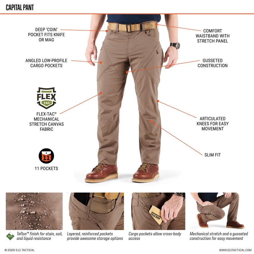 Low-profile style meets high-level tactical functionality in the Capital Pant. It’s built for toughness and freedom of movement, featuring our polyester/cotton Flex-Tac® canvas fabric with a Teflon™ finish to ward off stains and soiling. The comfort waistband moves with you, and works with you: It features a flex cuff tunnel and cuff key pocket. Discreet mag pockets at the back yoke and low-pro cargo pockets add utility that won't get in your way. This pant will look sharp with everything from an untucked tee to a 5.11 button-up and a blazer. For clean style and total versatility, it has to be the Capital.