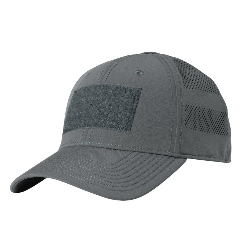 - 5.11 logos at side brim, at top of crown, and on sweatband