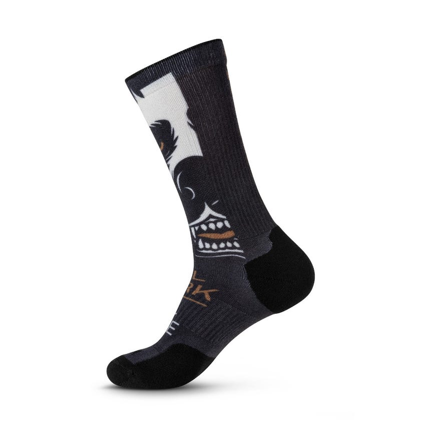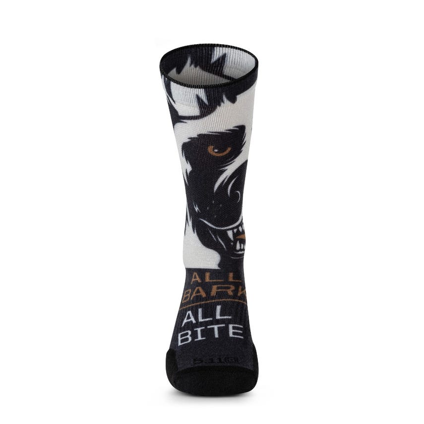 Unleash your inner beast with the Sock & Awe Crew All Bark Zoom socks. Featuring a striking graphic of a fierce canine, these socks embody the mantra "All Bark, All Bite." Perfect for adding a playful edge to your ensemble, their durable construction ensures they're more than just a fashion statement. Revel in comfort and style, proving you can always make a bold impression from the ground up.