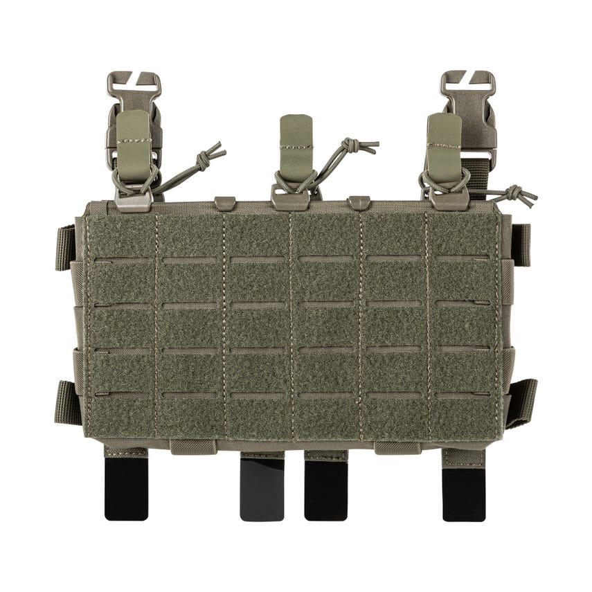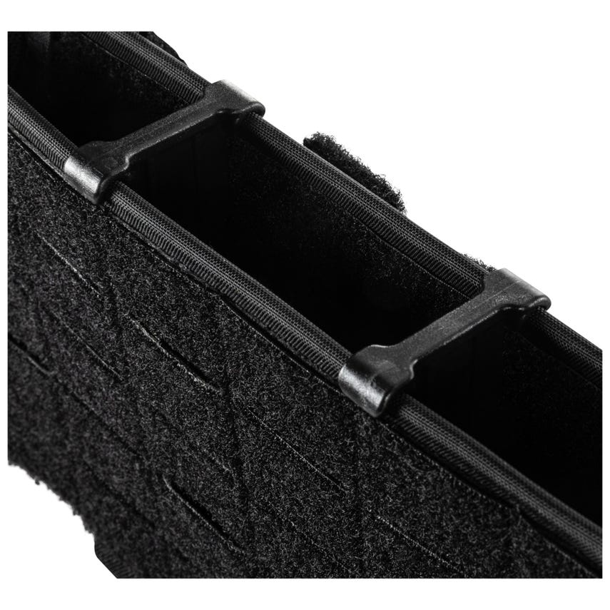 The Patent Pending Smart Track System is a dual-rail construction with removable and adjustable custom dividers and bungee retention kits to provide a secure fit and retention for contents. The interior of the placard is also loop lined and compatible with hook compatible inserts including the divider, flap and zipper top from the Modular Mini Pouch (56835). Fits three AR/5.56 magazines or two AK/7.62 mags or other equipment.