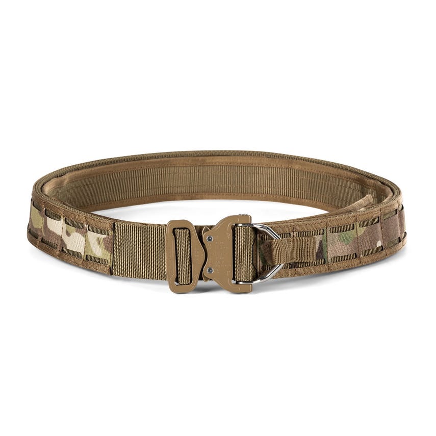 Uncomfortable and abrasive gear belts that require escape-artist skills to don and ditch are a thing of the past with our Maverick Battle Belt D-Ring. The AustriAlpin COBRA® buckle gets you in and out fast. Our Maverick Battle Belt D-Ring uses a multi-layer approach to providing all-day comfort that begins with proprietary TAC-LAM™ high-strength laminate on the outer belt in an ergonomically curved shape. It wears dual nylon webbing in the interior with a hook face that securely attaches to the interior, loop-faced nylon belt. Generous laser-cut laminate MOLLE slots provide plenty of real estate for attaching duty gear. A tie-down strap secures the D-ring when not needed. Authentic MultiCam print.