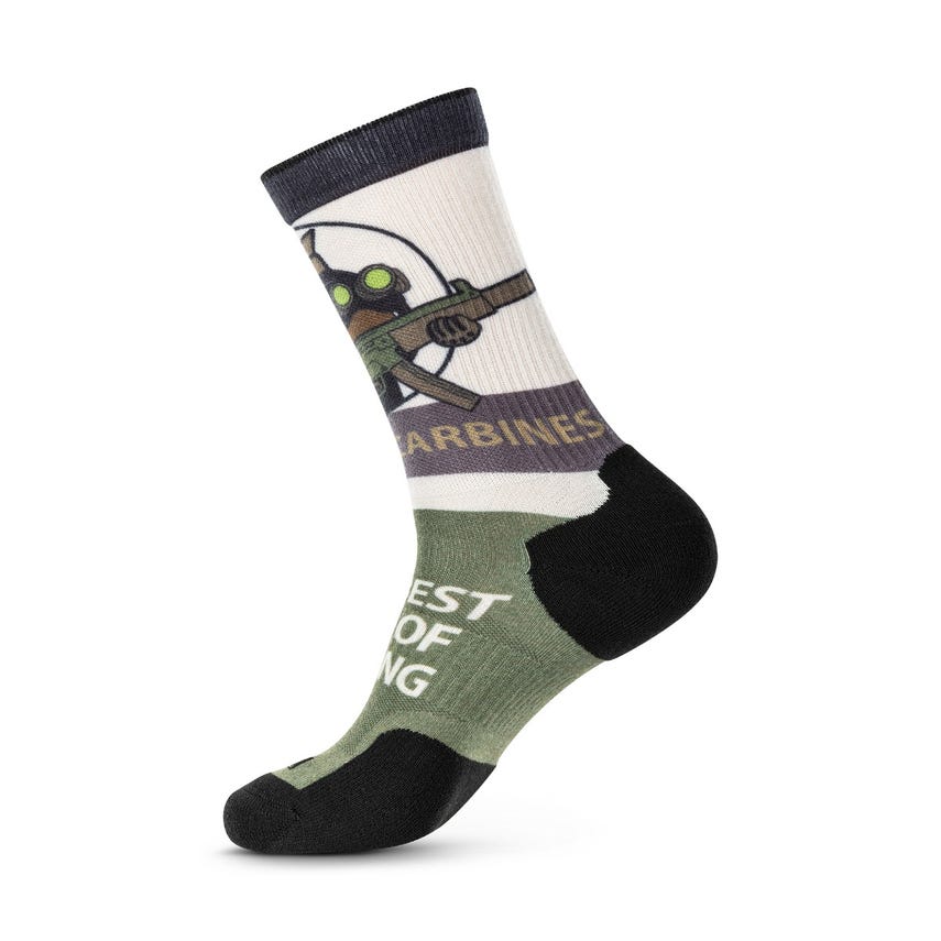 Fuel your mission with a jolt of humor. These "Coffee & Carbines" socks are the ultimate blend of tactical and fun, featuring a coffee pot with night vision goggles, ready for any morning operation. Designed for comfort and durability, they remind us that the best part of gearing up is starting with a strong cup of joe. Your feet?and your sense of humor?will thank you.