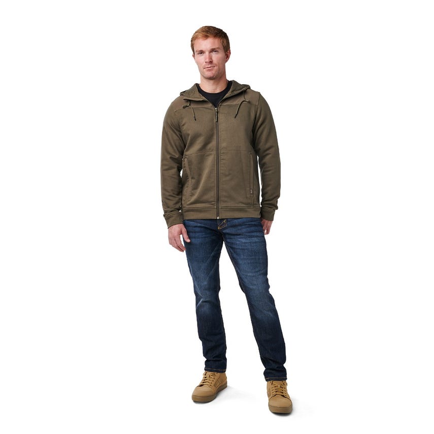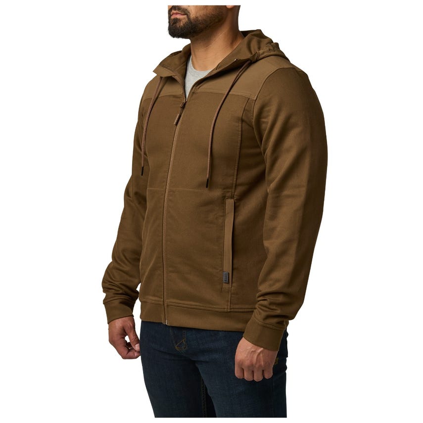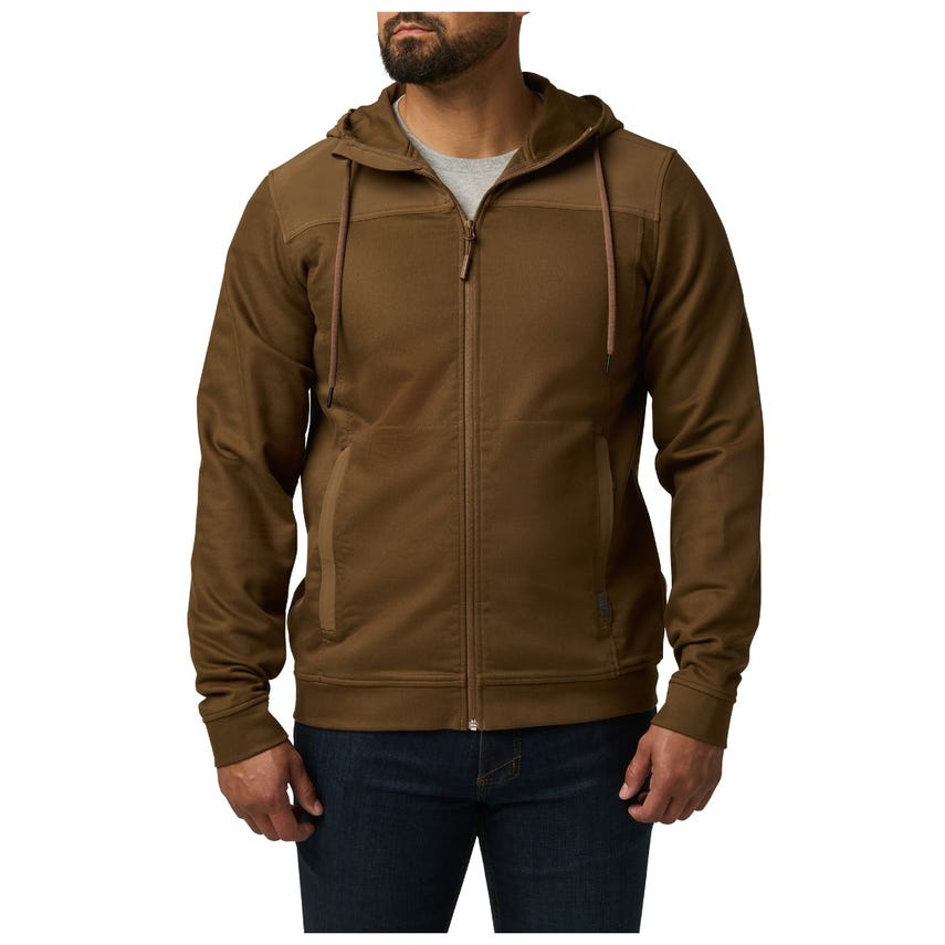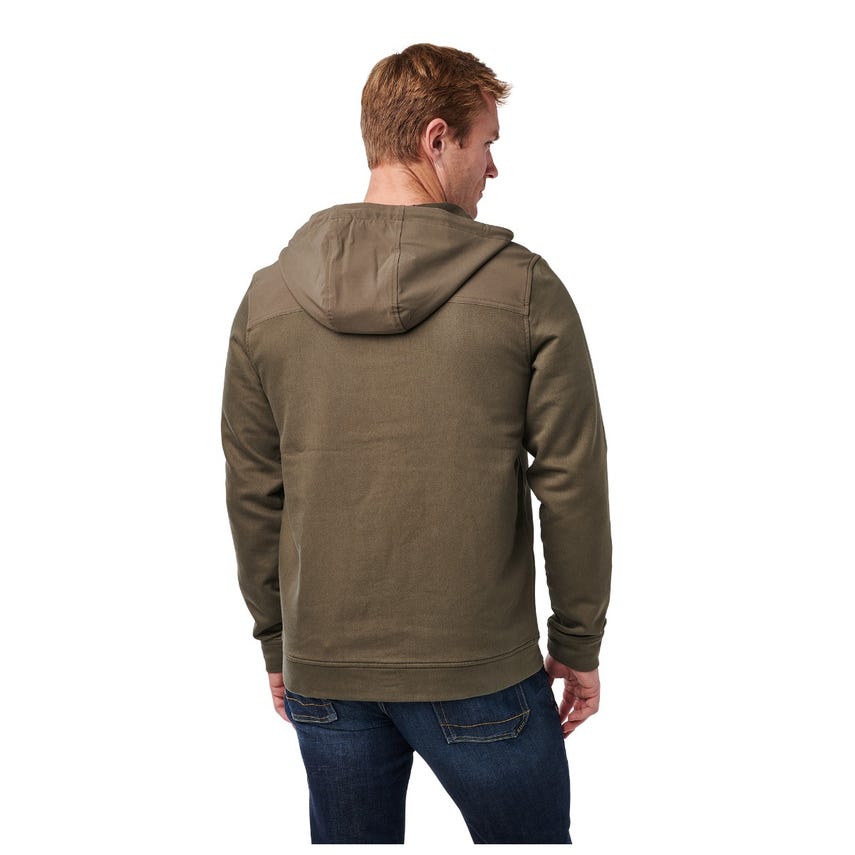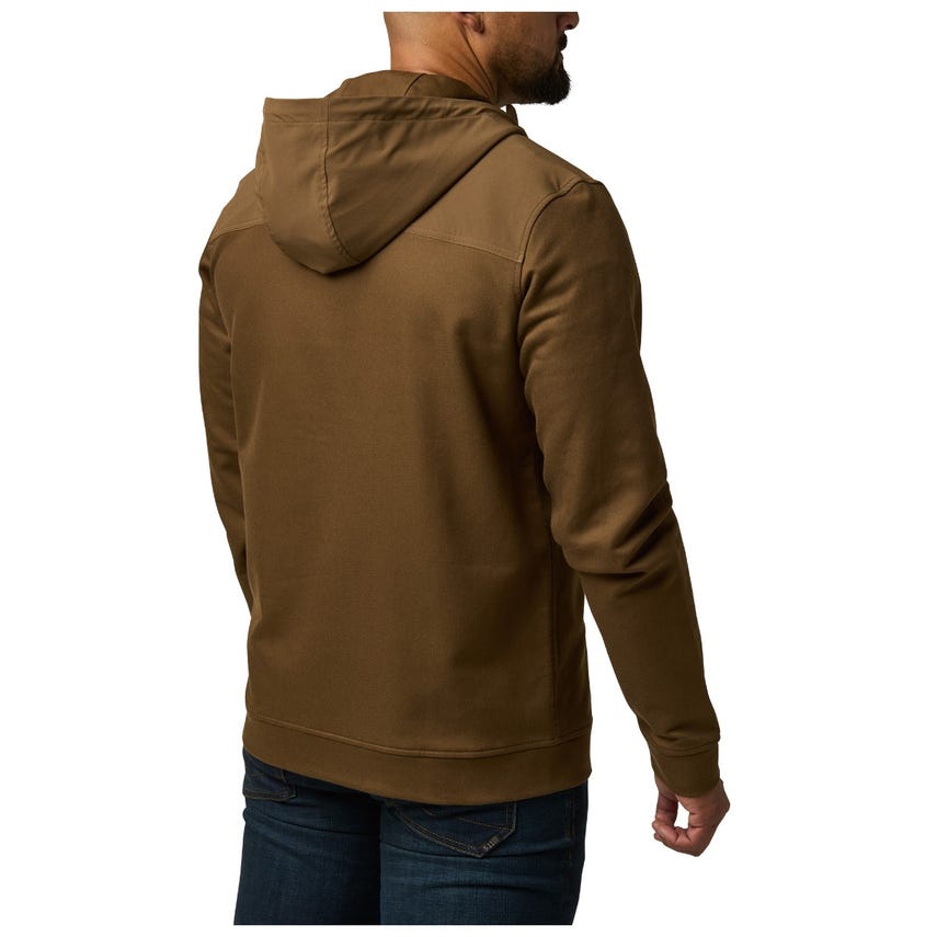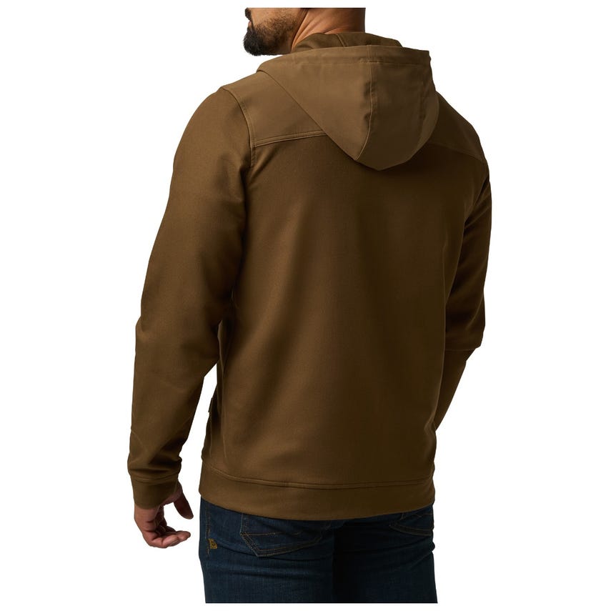 It’s time to upgrade your hoodie. Tougher than a typical hooded sweatshirt, our lo-vis Plummet Jacket is constructed from a rugged cotton-polyester blend, infused with elastane for freedom of movement. To protect against the elements and guard against chafing under a heavy load, we fortified the shoulders, upper back, chest and hood with DWR-coated overlays. A one-way zipper on the front ensures quick on and off, while the internal chin guard prevents those annoying zipper bites. Secure your keys, phone and other essentials inside the two zippered pockets on the front. Cinch down the hood and hit the trail or the street.