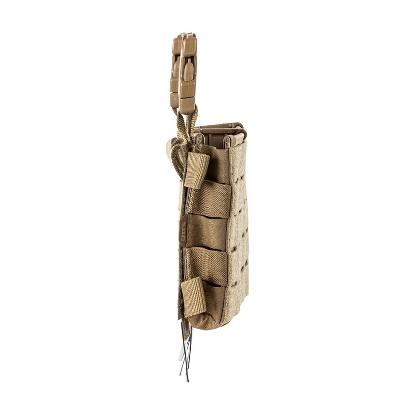 The Patent Pending Smart Track System™ is a dual-rail construction with removable and adjustable custom dividers and bungee retention kits to provide a secure fit and retention for contents. The interior of the placard is also loop lined and compatible with hook compatible inserts including the divider, flap and zipper top from the Modular Mini Pouch (56835). Fits three AR/5.56 magazines or two AK/7.62 mags or other equipment.
