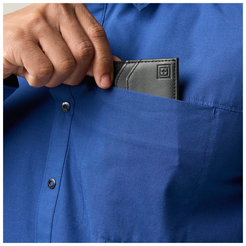 The Igor Solid Long Sleeve Shirt sports a contemporary look that works just as hard after hours as it does on the job. Constructed from 60% cotton and 40% polyester poplin, the Igor provides long-lasting comfort and wear. Beneath that exterior beats the 5.11 functionality you’ve come to expect. Our center-front RAPIDraw™ snap placket enables fast access to EDC gear, phone, wallet or passport. A fold-down collar, shirt-tail hem and button-adjustable cuffs keep everything on point. The on-seam pocket on the left chest provides traditional storage for items that don’t require added security.