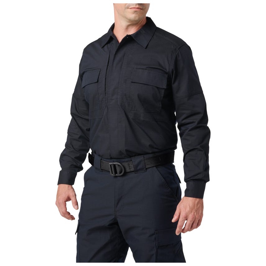 Now available in 5.11's Flex-Tac® mechanical stretch fabric, the TDU® shirt offers time-tested performance and utility for tactical duty uniforms. ReadyPocket™ at left and right chest, double-layered rear yoke and mic cord pass through. The Flex-Tac TDU shirts feature melamine buttons behind a center front placket and include epaulette and badge tab kits packaged with the product. Imported.