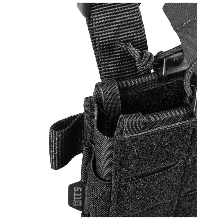 The Patent Pending Smart Track System is a dual-rail construction with removable and adjustable custom dividers and bungee retention kits to provide a secure fit and retention for contents. The interior of the placard is also loop lined and compatible with hook compatible inserts including the divider, flap and zipper top from the Modular Mini Pouch (56835). Fits three AR/5.56 magazines or two AK/7.62 mags or other equipment.