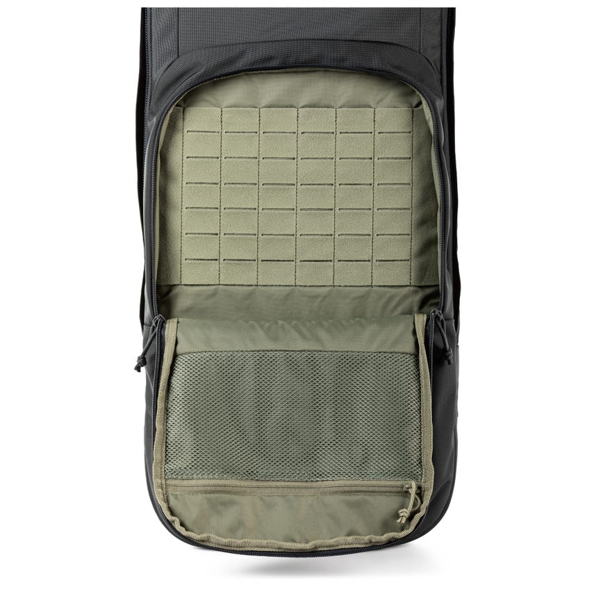 - Front pocket with loop faced laser-cut MOLLE platform and zippered mesh pocket