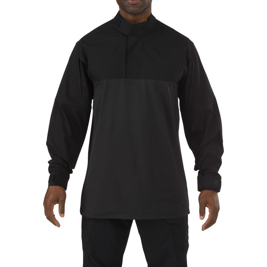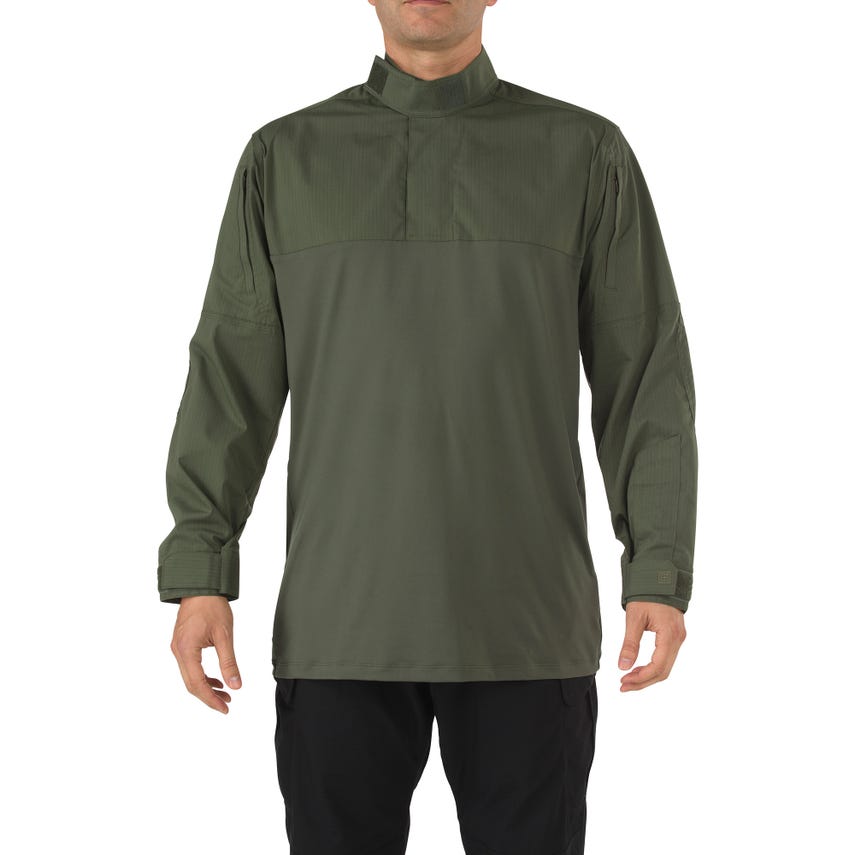 The 5.11 Stryke® TDU® Rapid Shirt offers unparalleled maneuverability, durability, and utility in any demanding environment. The shirt is built from our Flex-Tac® mechanical stretch fabric with a soft, moisture-wicking knit body, and features reinforced, articulated elbows with a Teflon® finish for stain and soil resistance. Adjustable cuffs, a mandarin collar, and a quarter-zip front ensure a secure fit; and badge tab and loop patch platform allow complete uniform integration. With vertical sleeve pockets and forearm pen pockets, the 5.11 Stryke® TDU® Rapid Shirt provides ideal storage solutions. When you're living on the edge, it's good to know your storage game is tight.