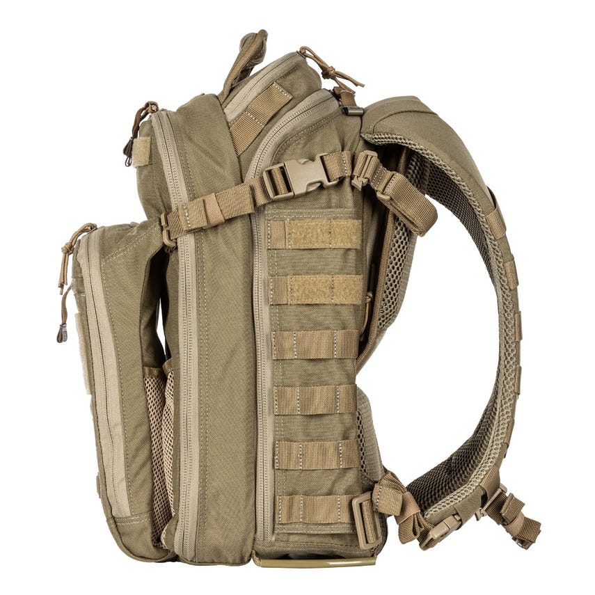 However you need to pack it, carry it, attach it, or stow it, the All Hazards Nitro can handle it. Ruggedly constructed, with plenty of unique features, this compact, fully functional pack is perfect as a carry-on, patrol bag, or long range tactical kit. It has dual main compartments, a bucket-lid opening for easy access, pass-through slots for breaching tools or a baton, loop patches, and a MOLLE-and SlickStick®-compatible web platform on three sides and bottom lash points. The lining is none other than orange to make identifying your gear in low-light much easier. And the all-purpose shove-it pocket holds your helmet or extra cargo. For those who prefer to take the fight with them, this is the bag of the brave. Imported.