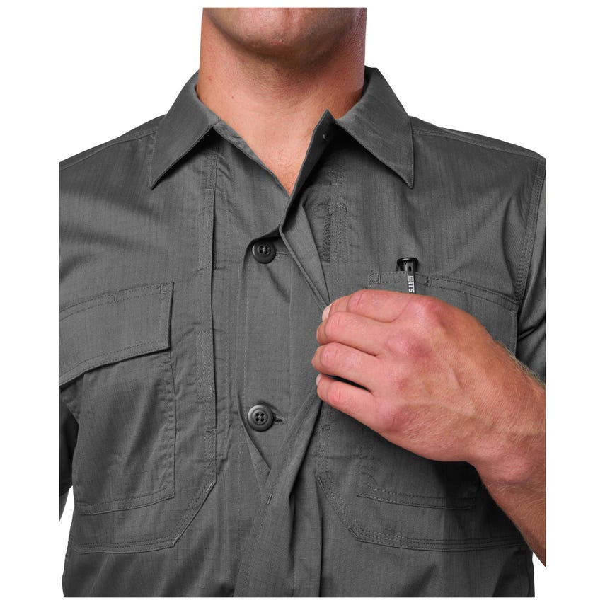 Now available in 5.11's Flex-Tac® mechanical stretch fabric, the TDU® shirt offers time-tested performance and utility for tactical duty uniforms. ReadyPocket™ at left and right chest, double-layered rear yoke and mic cord pass through. The Flex-Tac TDU shirts feature melamine buttons behind a center front placket and include epaulette and badge tab kits packaged with the product. Imported.