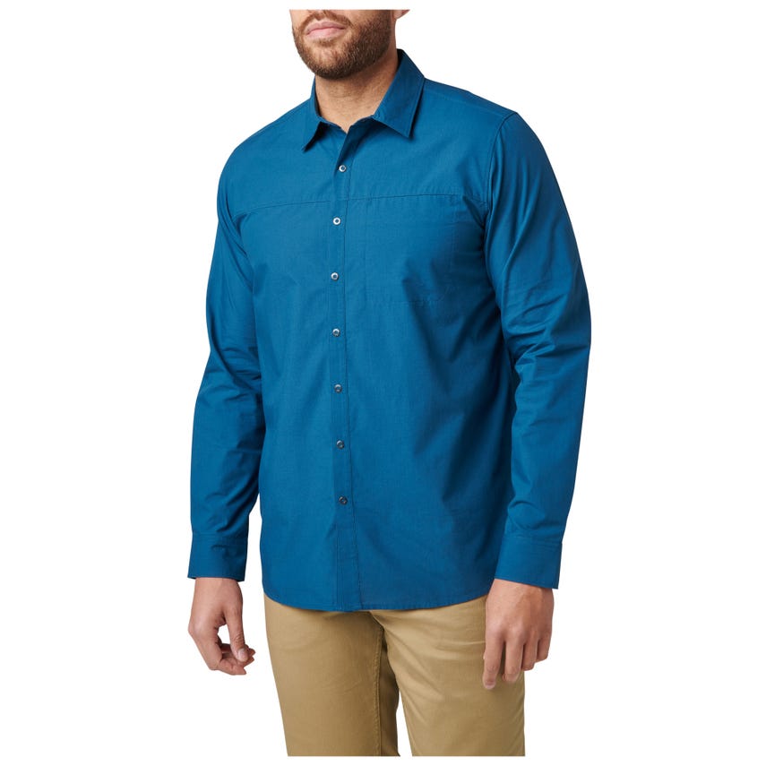 The Igor Solid Long Sleeve Shirt sports a contemporary look that works just as hard after hours as it does on the job. Constructed from 60% cotton and 40% polyester poplin, the Igor provides long-lasting comfort and wear. Beneath that exterior beats the 5.11 functionality you’ve come to expect. Our center-front RAPIDraw™ snap placket enables fast access to EDC gear, phone, wallet or passport. A fold-down collar, shirt-tail hem and button-adjustable cuffs keep everything on point. The on-seam pocket on the left chest provides traditional storage for items that don’t require added security.