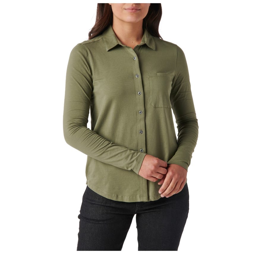 When you need a versatile top that will transition from work to the range and then out to dinner afterward, reach for the Quinn Long Sleeve Shirt. This casual shirt features a comfortable blend of cotton and super-soft modal with a touch of elastane for stretch. A stylish two-piece collar is designed to maintain its shape while traveling or stored in a gym locker. The shirttail hem can be worn tucked or untucked—perfect for pairing with pants or jeans. Snap buttons and a chest pocket with pen guide add chic functionality.