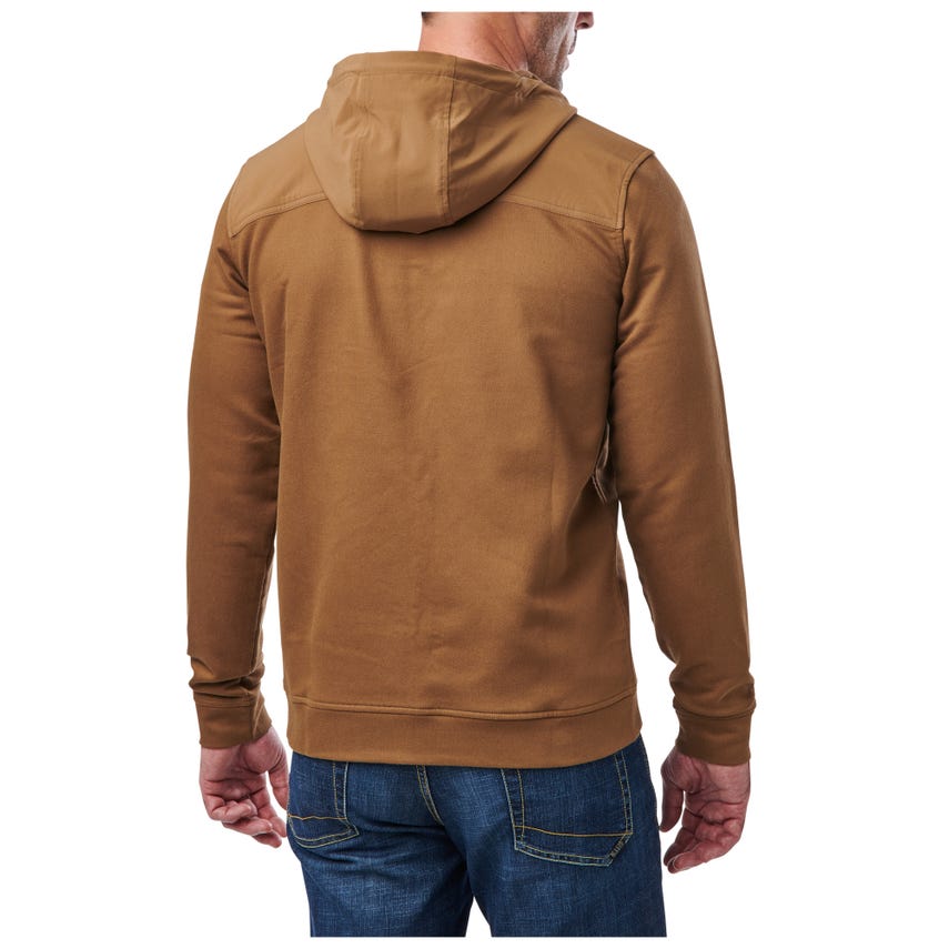 It’s time to upgrade your hoodie. Tougher than a typical hooded sweatshirt, our lo-vis Plummet Jacket is constructed from a rugged cotton-polyester blend, infused with elastane for freedom of movement. To protect against the elements and guard against chafing under a heavy load, we fortified the shoulders, upper back, chest and hood with DWR-coated overlays. A one-way zipper on the front ensures quick on and off, while the internal chin guard prevents those annoying zipper bites. Secure your keys, phone and other essentials inside the two zippered pockets on the front. Cinch down the hood and hit the trail or the street.