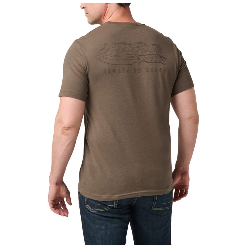 Embrace your inner adventurer with the Knife Horizon Tee. This shirt features a striking knife silhouette set against rugged peaks, perfectly capturing the spirit of "Always Be Ready." Made from a soft, moisture-wicking cotton/poly blend, it promises lasting comfort and durability. Wear it as a badge of your readiness for whatever challenges the horizon may bring.
