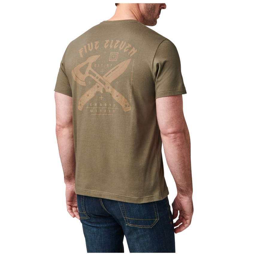 When you're wielding decisions like a double-edged axe, make sure you "Choose Wisely." This tee cleverly features crossed axes and knives, nodding to the art of ancient choices. Crafted from a soft ringspun cotton/poly blend, it merges comfort with durability, ensuring your style never fades, much like your discerning taste.