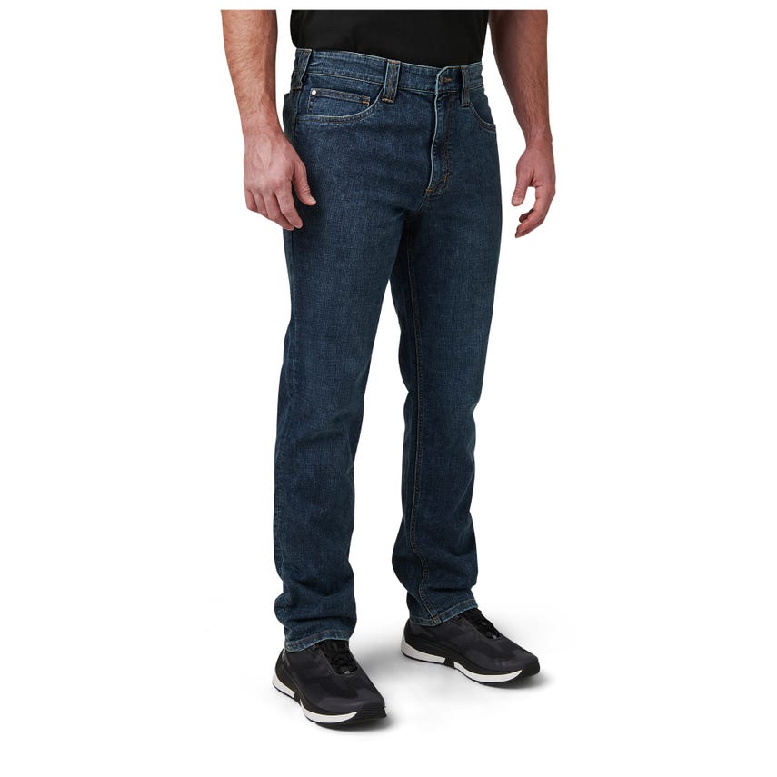 Blending in doesn't require surrendering EDC space or comfort with our Defender-Flex Jean Straight pants. Their classic, straight-cut look will fit in anywhere you go. The five-pocket style with an additional two pockets make an ideal choice when leaving critical gear behind is not an option. A non-logo, shank-button closure up front, along with non-logo rivets at the hand pockets keep things discrete. Reinforced belt loops and hand pockets reinforced with Nylon 6 increase longevity. Constructed from 76-percent cotton and 24-percent polyester with T400 mechanical stretch denim, the Defender-Flex Jean Straight will never bind on you. It's the perfect jean for a weekend in the backcountry or a night out on the town. More styles available: shop the Defender-Flex Collection.