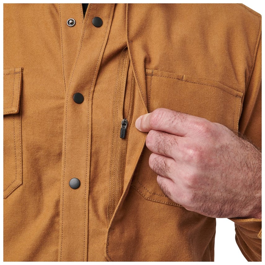 Pulling double duty is the Randolph Shirt Jacket’s specialty. The cotton-elastane twill construction and professional style look sharp in any situation, while remaining truly tactical. Urban-friendly functionality begins with our RAPIDraw™ snap placket that keeps your everyday essentials hidden within reach. Left and right chest pockets with flaps, concealed closures and pen guides provide additional carry options. A pair of hand pockets and sleeve cuffs with adjustable snap closures maintain warmth, while side seam vents ensure all-day comfort. Add internal dump pockets and our Randolph Shirt Jacket provides seven places to store essential EDC, office or vacation items. You’ll be ready for whatever comes your way.