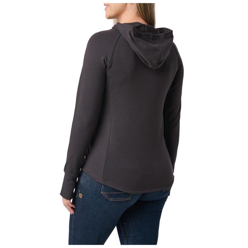 Comfort and utility combined with a unique cross-over opening for warmth and style. The Donna Hoodie is lightweight, durable, and visually appealing. The moisture wicking fabric keeps you dry while thumbholes at the sleeve cuffs and kangaroo front pocket keep your hands warm and cozy. Imported.