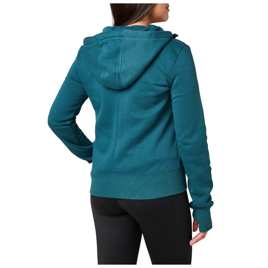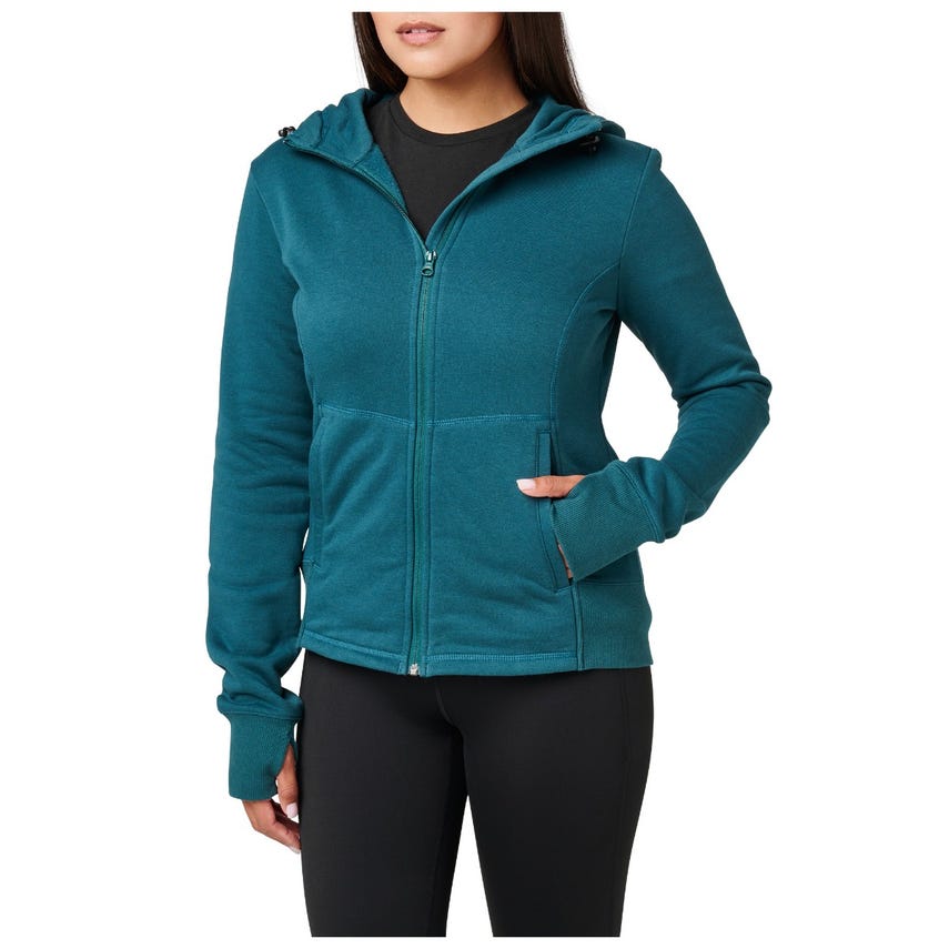 When the temperature suddenly drops, our Kimmie Full Zip Hoodie offers a warm hug. The 60% cotton and 40% polyester fleece construction provides a cozy outer layer on cool days and doubles as an inner layer when the mercury really plunges. An internal shock cord system keeps the stationary lined hood in place in heavy winds and while running. A durable front zipper design with chin guard works in tandem with rib knit cuffs and waistband to help beat the cold. Thumbholes hold the sleeves in place when you're training, working, or adding layers. Side entry welt hand pockets keep essential items at hand and fingers toasty warm. A reflective transfer on the right sleeve increases visibility during early morning and late evening runs. Fight the chill, with the Kimmie Full Zip Hoodie.
