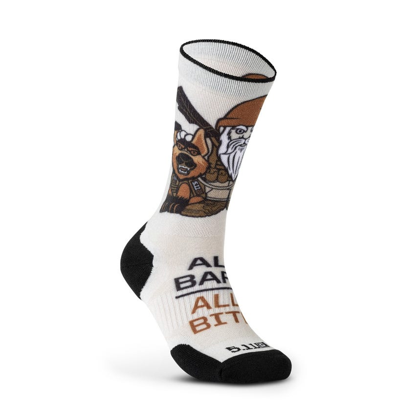 Unleash your inner gnome ranger with these playful ?Sock & Awe? Crew K9 socks, featuring a tactical team-up of a trusty dog and a gnome on a mission. With a cheeky ?All Bark, All Bite? motto in tow, these socks blend comfort and humor, perfect for anyone looking to add a touch of whimsy to their tactical gear. Ideal for everyday adventures or downtime.