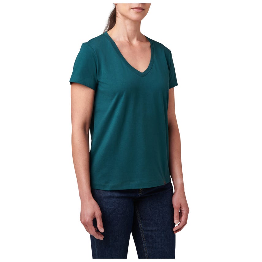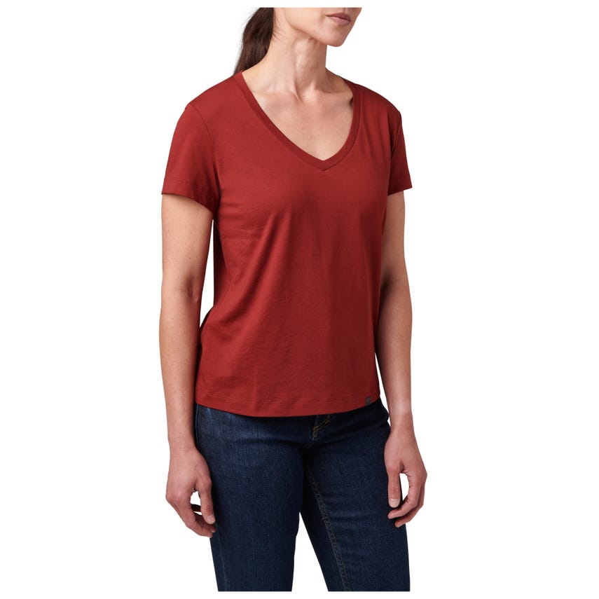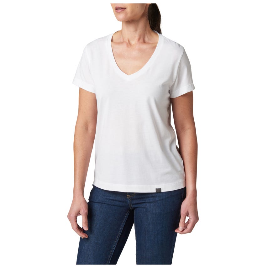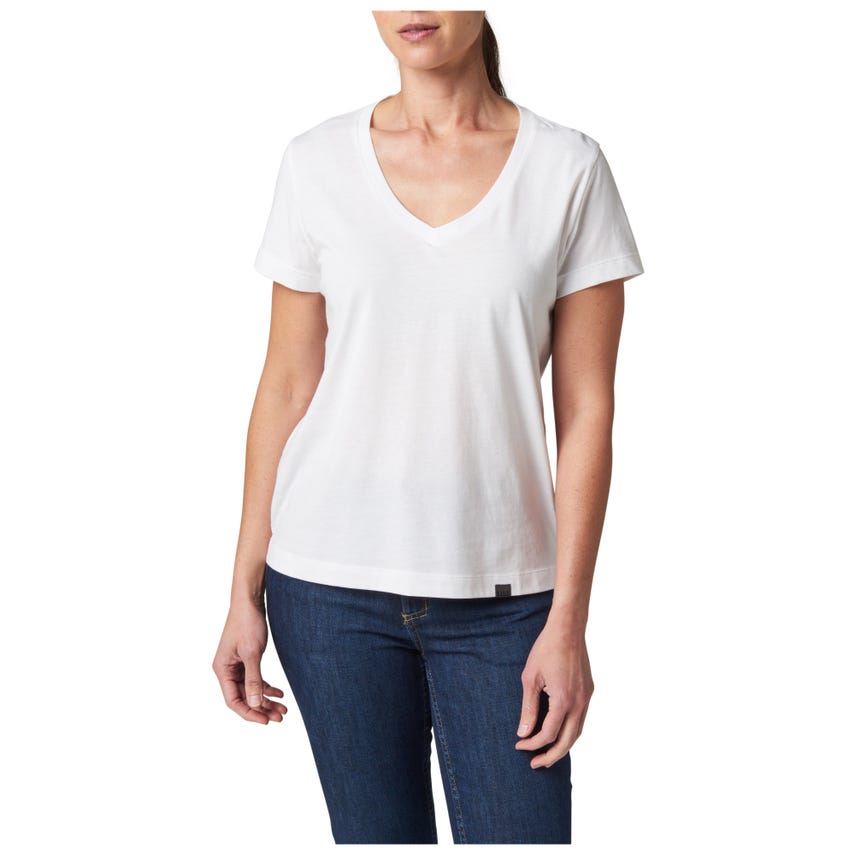 Meet your favorite new V-neck top. The wicking properties of our Essential V-Neck Short Sleeve Tee make it ideal for a variety of activities. The classically styled V-neck is made from a comfortable 60% cotton and 40% polyester blend that's lightweight and renowned for pulling sweat away. A 5.11[+]® clip label finishes out the straight hem - which is the perfect length for concealed carry. The Essential V-Neck Short Sleeve Tee can be worn tucked or untucked, by itself or as a layer underneath a button-up shirt. It pairs easily with 5.11® jeans, pants, and shorts.