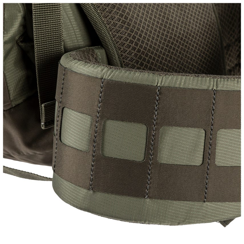 - Lumbar pad with removable hip belt; Laser-cut laminate MOLLE and quick release buckle