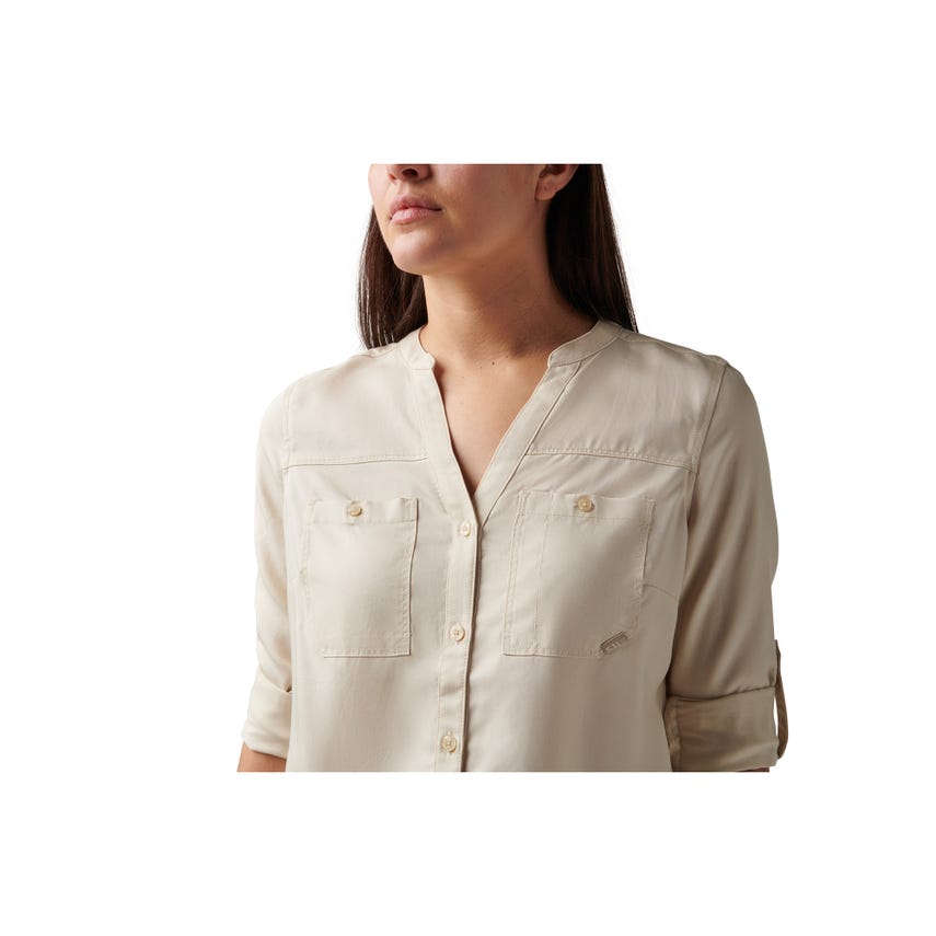 Tactical tailoring for the stylish woman. The Leslie Top features mandarin style collar, shirt tail hem, and adjustable sleeve button cuffs. The lightweight material is strong yet breathable and looks great for a day at the range or a night out on the town. Imported.