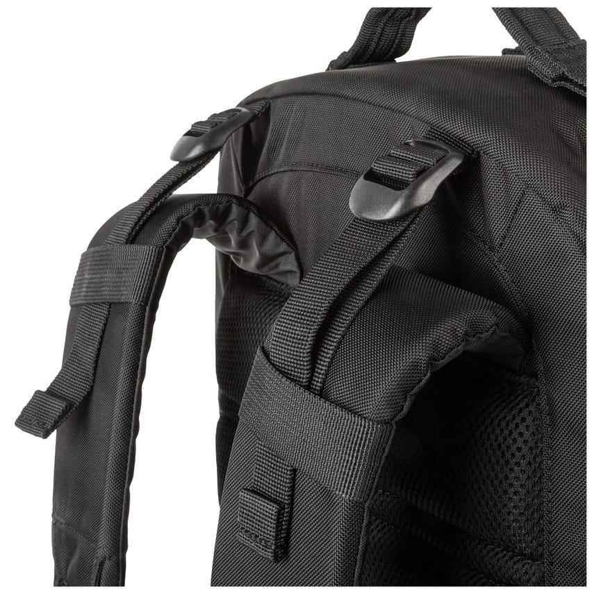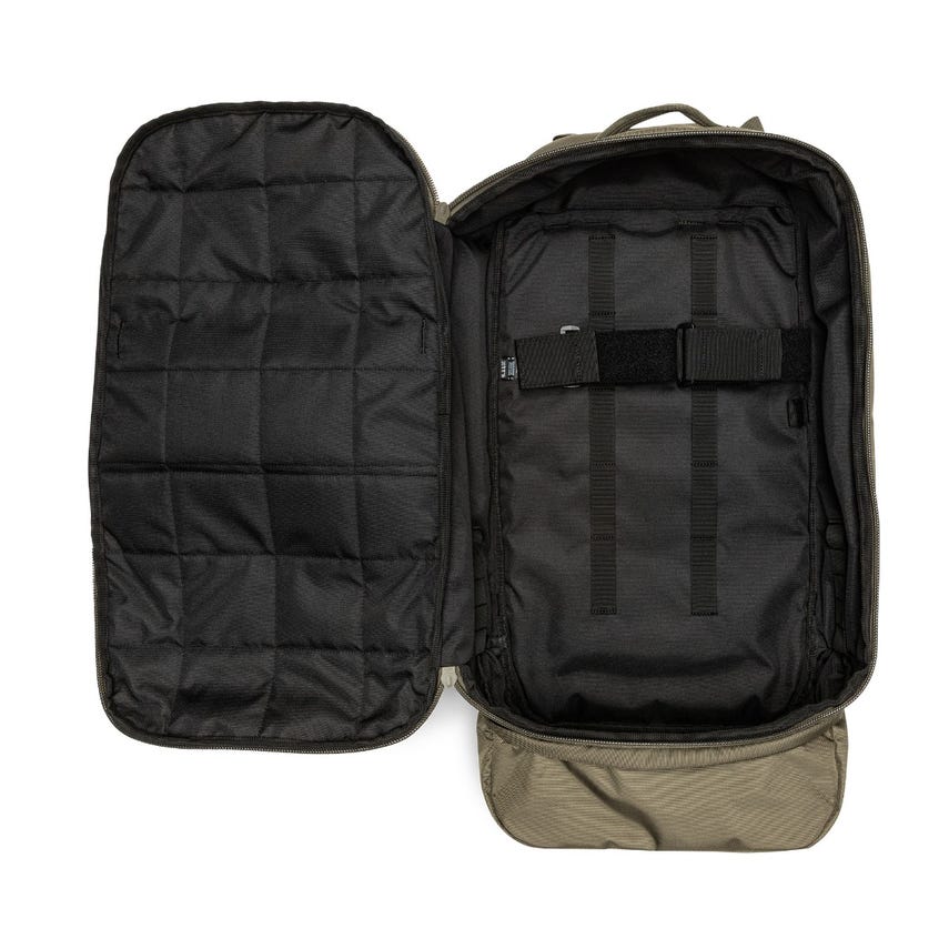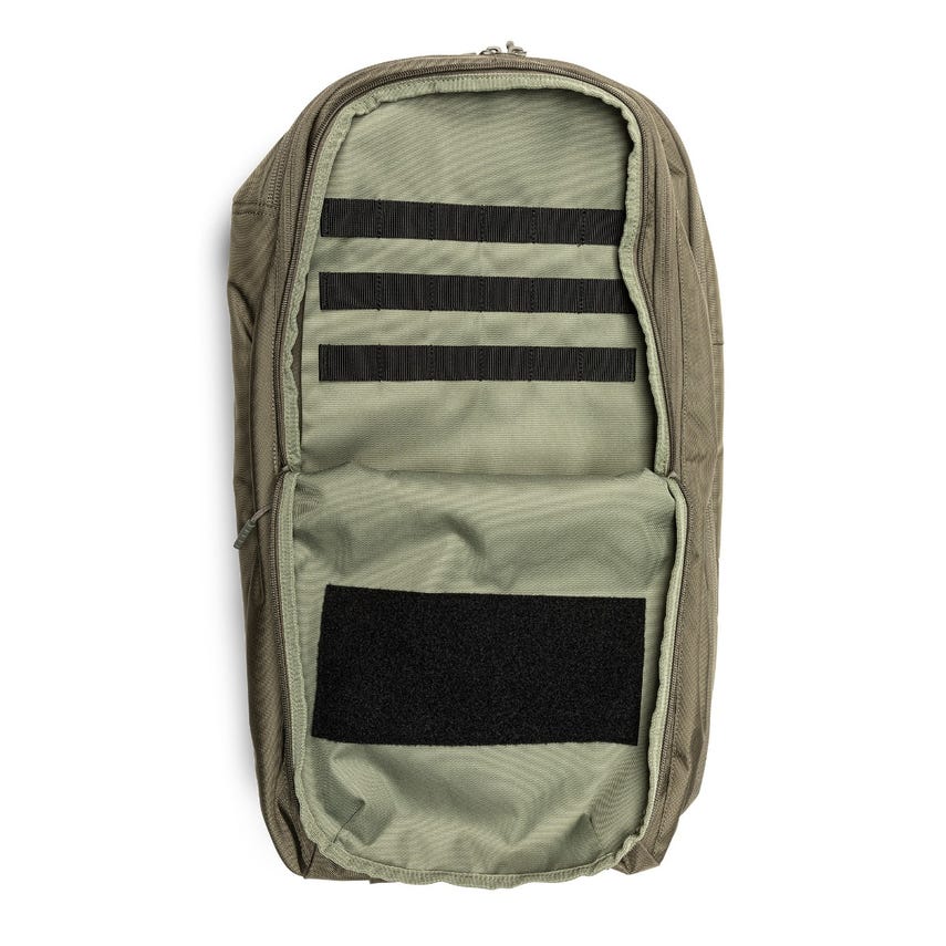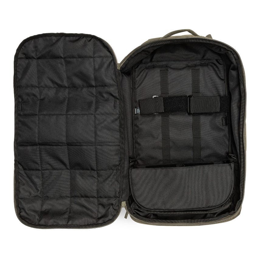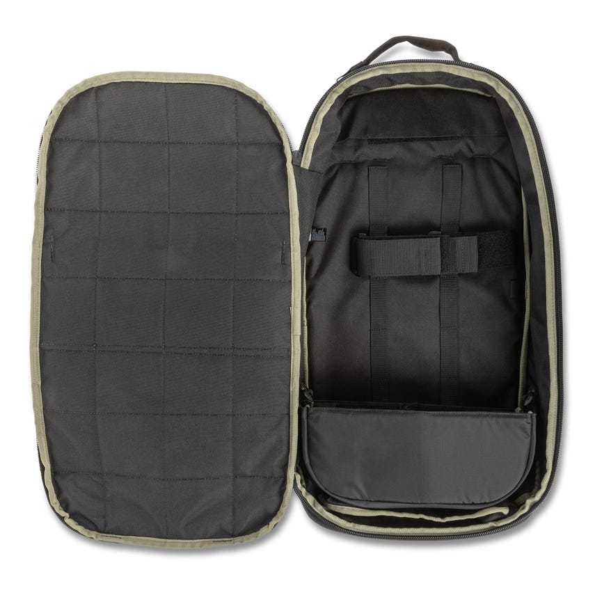 The LVC Covert Carry Pack has your six while deep undercover. 5.11's signature CenterLine�� design and tuckable labels help you keep a low profile. The outside is equipped with quick-release shoulder straps, a removable sternum strap, a side carry handle, and lower webbing straps for extra cargo or for attaching the 5.11 LVC6 bag. Dual front pockets are designed with admin organization and MOLLE webbing so you can organize your loadout to fit the mission. Inside the main compartment, a suspended padded laptop sleeve and a mesh zippered pocket give you more storage. The secondary weapon compartment has a reinforced muzzle pocket, web loops, and two rifle retention straps when you need to bring the heat. A 3" drop-down extension in the primary weapons compartment can accommodate compact or full-size firearms. Tri-glides for optional waist belt attachment, an aluminum frame HDPE board, and comfortable foam padding with a flex cuff channel on the back make this pack easy to wear. The LVC series pack that seamlessly combines comfort and covert.