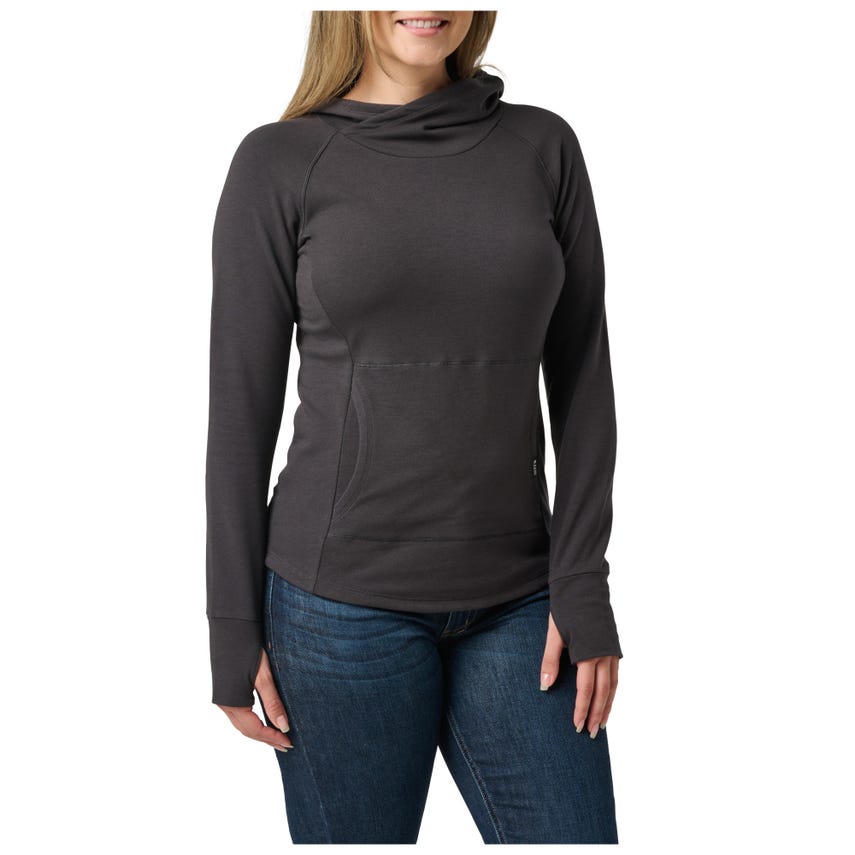 Comfort and utility combined with a unique cross-over opening for warmth and style. The Donna Hoodie is lightweight, durable, and visually appealing. The moisture wicking fabric keeps you dry while thumbholes at the sleeve cuffs and kangaroo front pocket keep your hands warm and cozy. Imported.