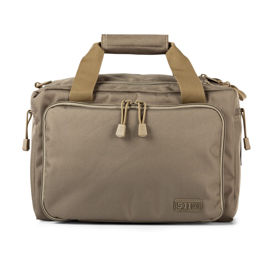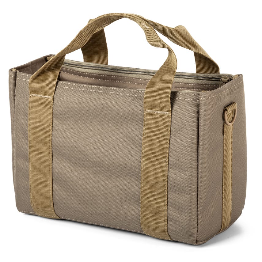 Constructed from durable, all-weather 600D Polyester, the Range Qualifier Bag features separate padded storage for multiple pistols, a zip-down front organizer that effectively stores 8 magazines, side pockets and a removable ammo tote to keep you topped off and for easy cleanup. With a padded should strap, easy-grip handles, and an ID insert, you'll be home on the range in no time.