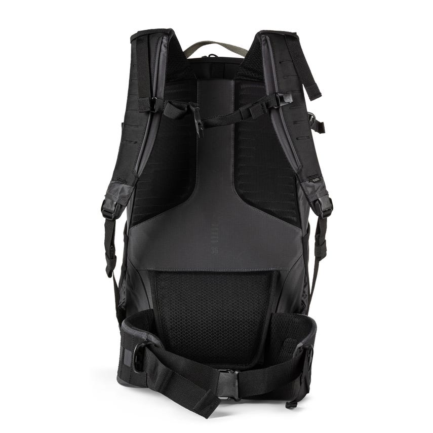 - Padded shoulder harness with sternum strap and laser-cut laminate MOLLE platform