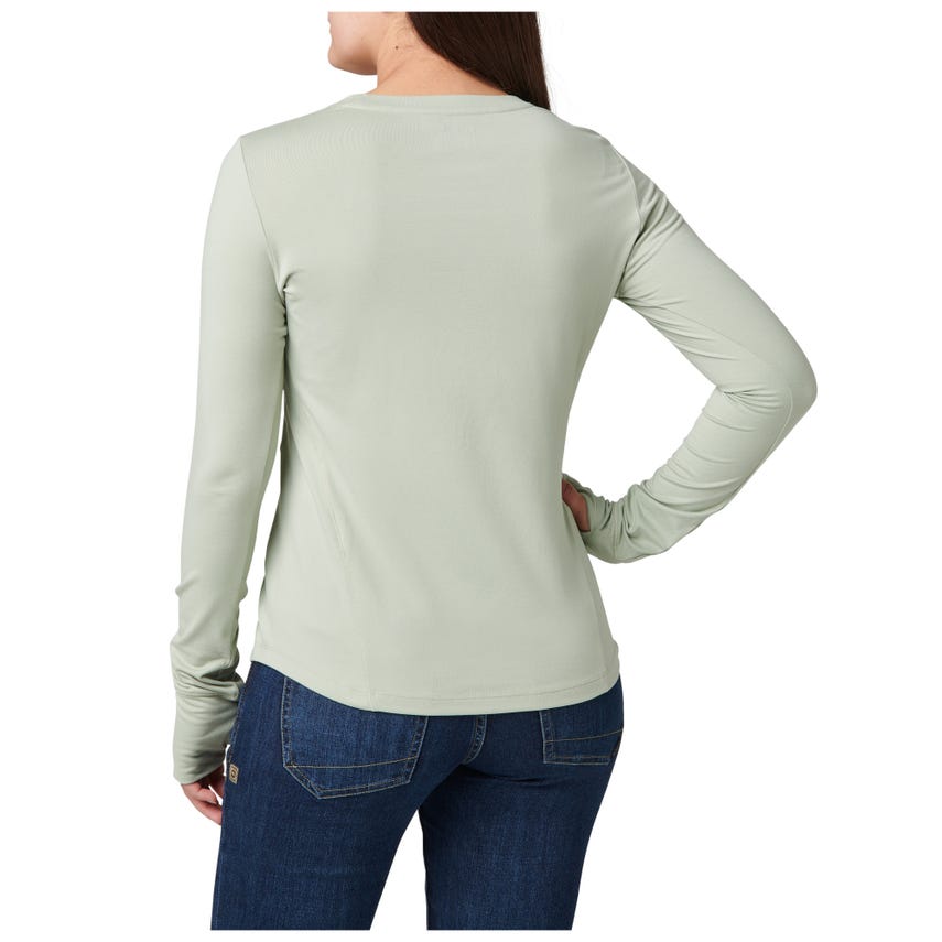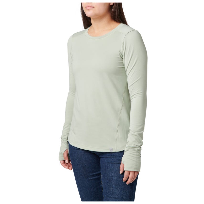No matter what your day brings, the Yelena Crew Long Sleeve Tee is ready for action. This crew-neck, long-sleeve top is constructed from durable yet soft polyester that's been enhanced with a touch of elastane for stretch. A moisture-wicking, anti-odor finish ensures the top stays fresh, while the UPF 50+ rating - the maximum achievable for fabrics - will keep the sun's harmful UV rays at bay. Flat-lock seams fight chafing, and thumbholes secure the sleeves while you're taking on the day's challenges. The curved hem design looks stylish when worn tucked or untucked. The Yelena works well alone and layered, and pairs easily with 5.11庐 jeans, pants, and shorts.